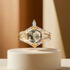 Our stunning ring set, featuring Moss Agate and White Diamonds, is a unique choice for your engagement. The hexagon-cut Moss Agate showcases its intriguing nature beautifully, while the bands complement its beauty in an eye-catching way.