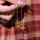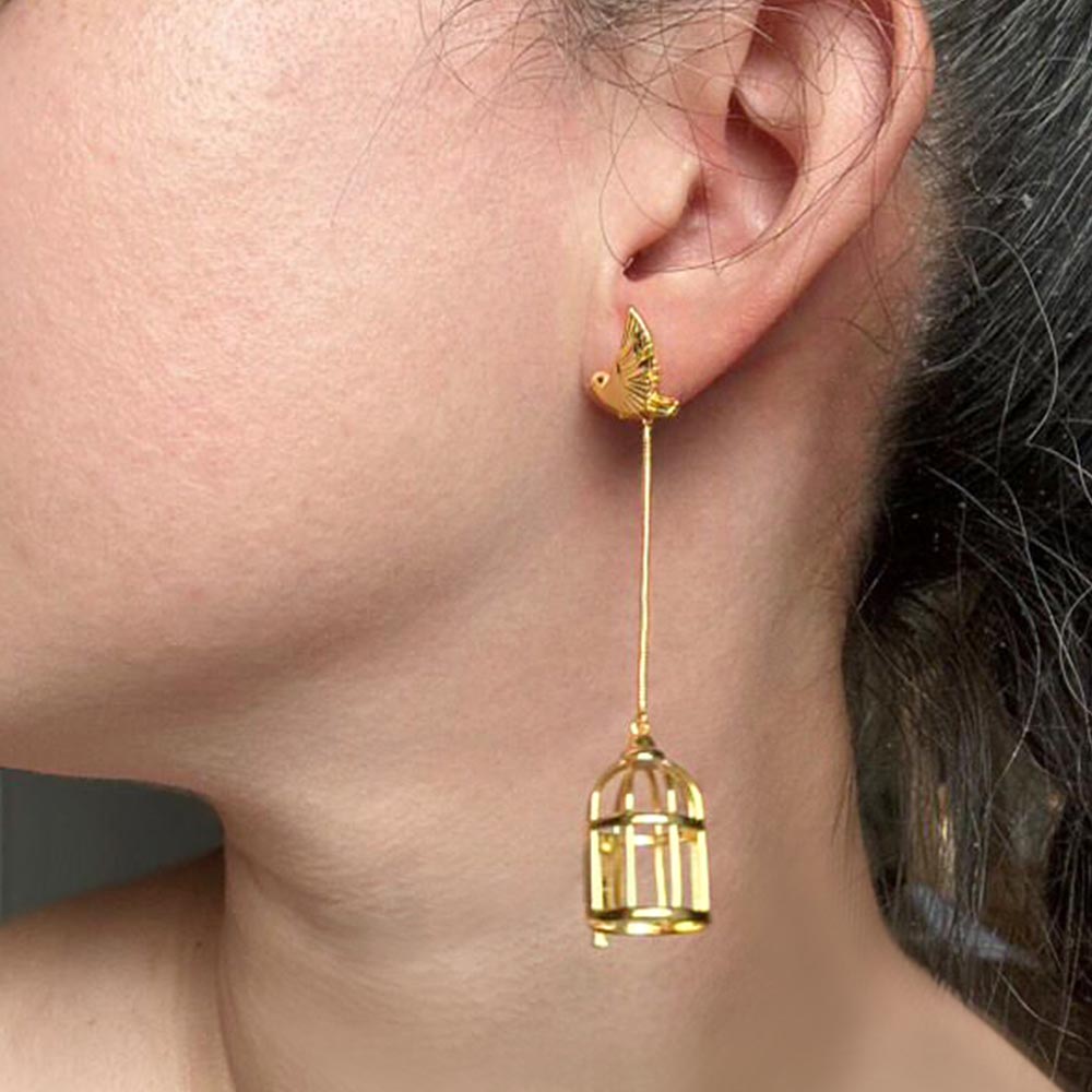 Each earring features a golden bird, poised as if in the moment of escape from an open cage that dangles elegantly from a thin chain. The design captures a moment of liberation, where the bird has just exited the cage, symbolizing freedom and the endless possibilities that come with unconditional love.