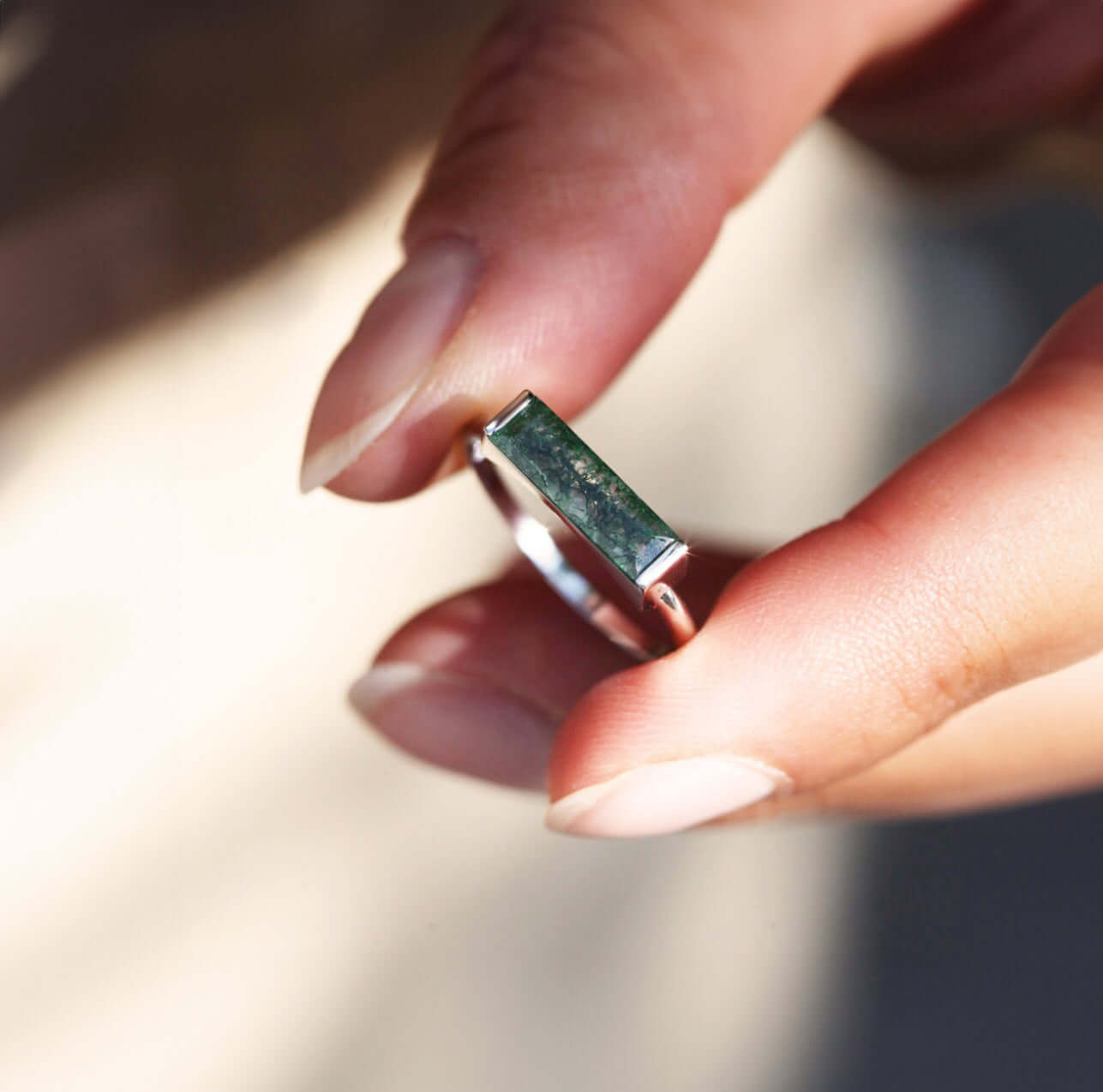 A stunning elongated Moss Agate ring featuring a baguette-cut green and white gemstone in a sleek bar setting. This design stands out as a modern, unique, and organic alternative to traditional solitaire wedding rings, making a perfect love statement.